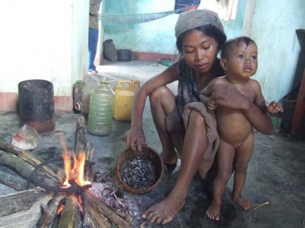 Chị Cao Thị Liên và rổ đựng nòng nọc. Ảnh Nguyễn Quang Vinh chụp tháng 10 năm 2006. "Nhà ông Cao Xuân Hiếu, 7 người đang ngồi, nằm trên nền đất, đói lả. Nhà nào cũng như vậy. Cái đói bao trùm."